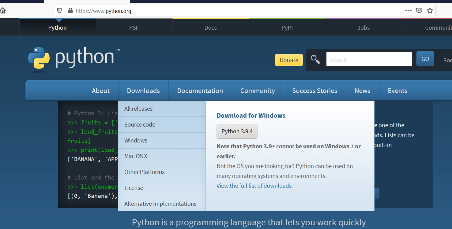 Ve a la página de Python, con el link de arriba, ubica el menú Downloads, posiciona el puntero sobre el y después en el menú que se despliega selecciona la versión de Python disponible y da clic sobre el botón que dice Python 3.4.9 o la versión que este disponible al momento de consultar.